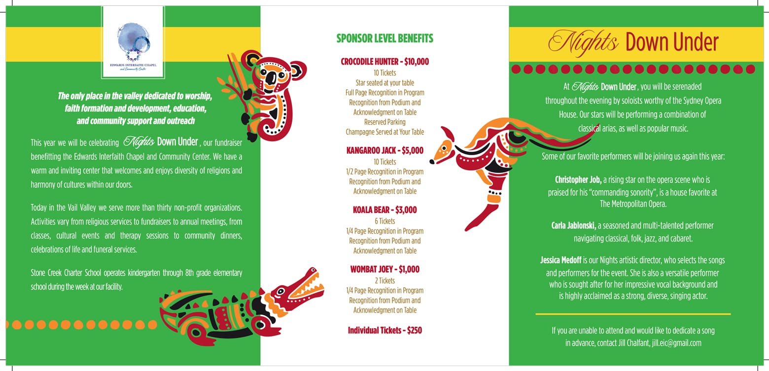 G’day Mates! Come join us for the annual fundraising event for the Edwards Interfaith Chapel as we are entertained by professional opera singers and other performers, dance, enjoy wine, and share a delicious meal together, prepared by Gourmet Cowboy!